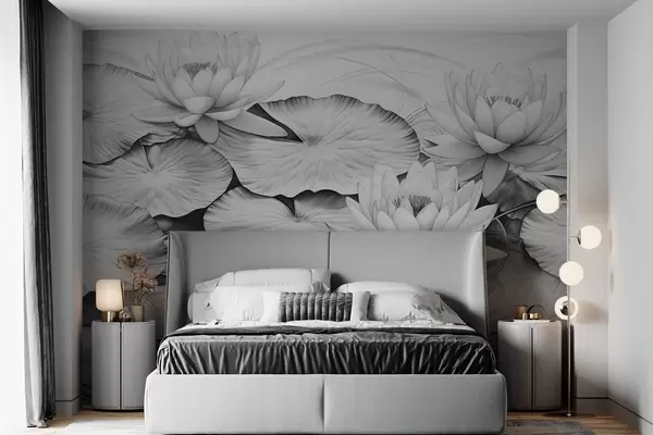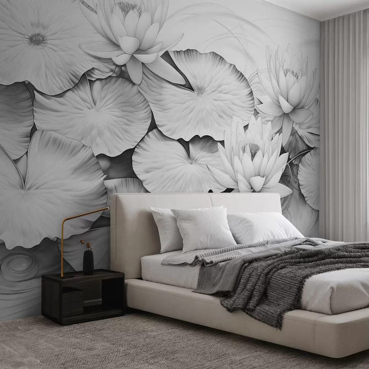 Zidne murale Lopoči i ljiljani u jezercu, crno-bijela imitacija crteža olovkom, detaljna botanička ilustracija, umjetnost prirode br. w09006