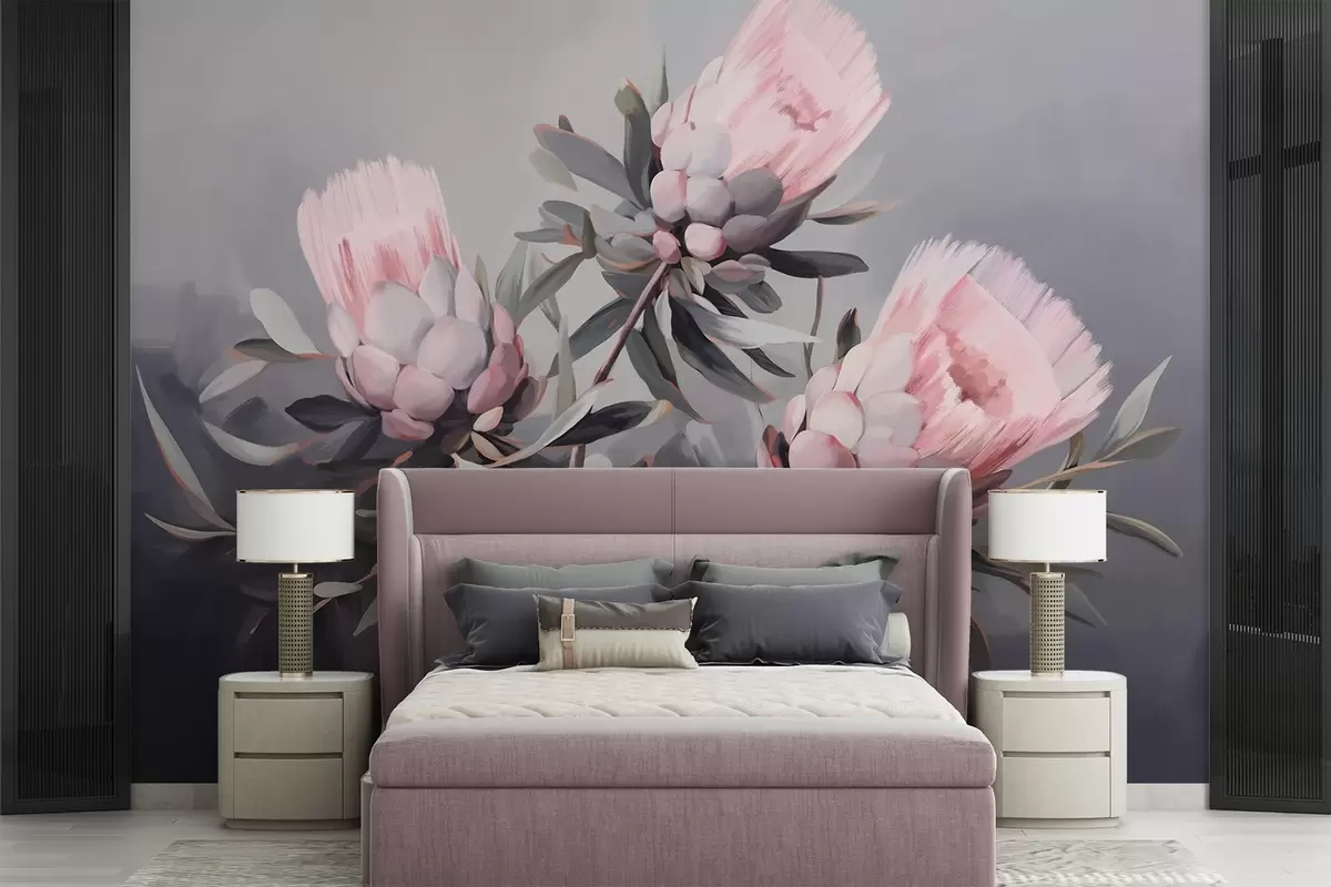 Zidne murale Ružičasti protea apstraktni cvjetovi sa sivim lišćem, meki teksturirani potezi kistom, prigušene boje, na zamućenoj sivoj pozadini br. w09014