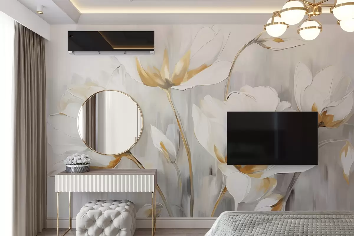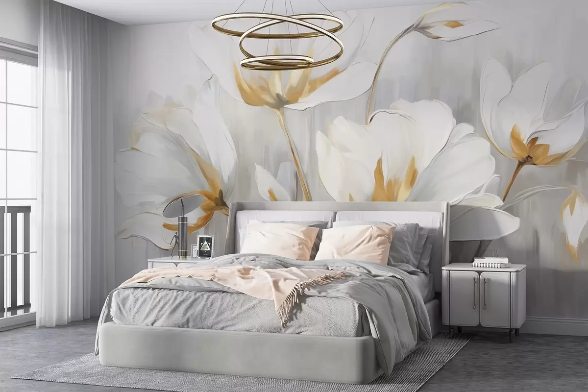 Zidne murale Bijelo apstraktno cvijeće s bijelim laticama i stabljikama na sivoj pozadini sa sivim i bijelim okomitim potezima kista br. w09047