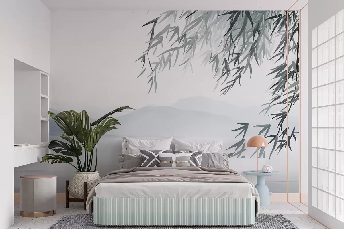 Zidne murale Lišće bambusa visi nad jezerom s planinama u pozadini, nježno plavi i bijeli tonovi, stil slikanja tintom br. w09048