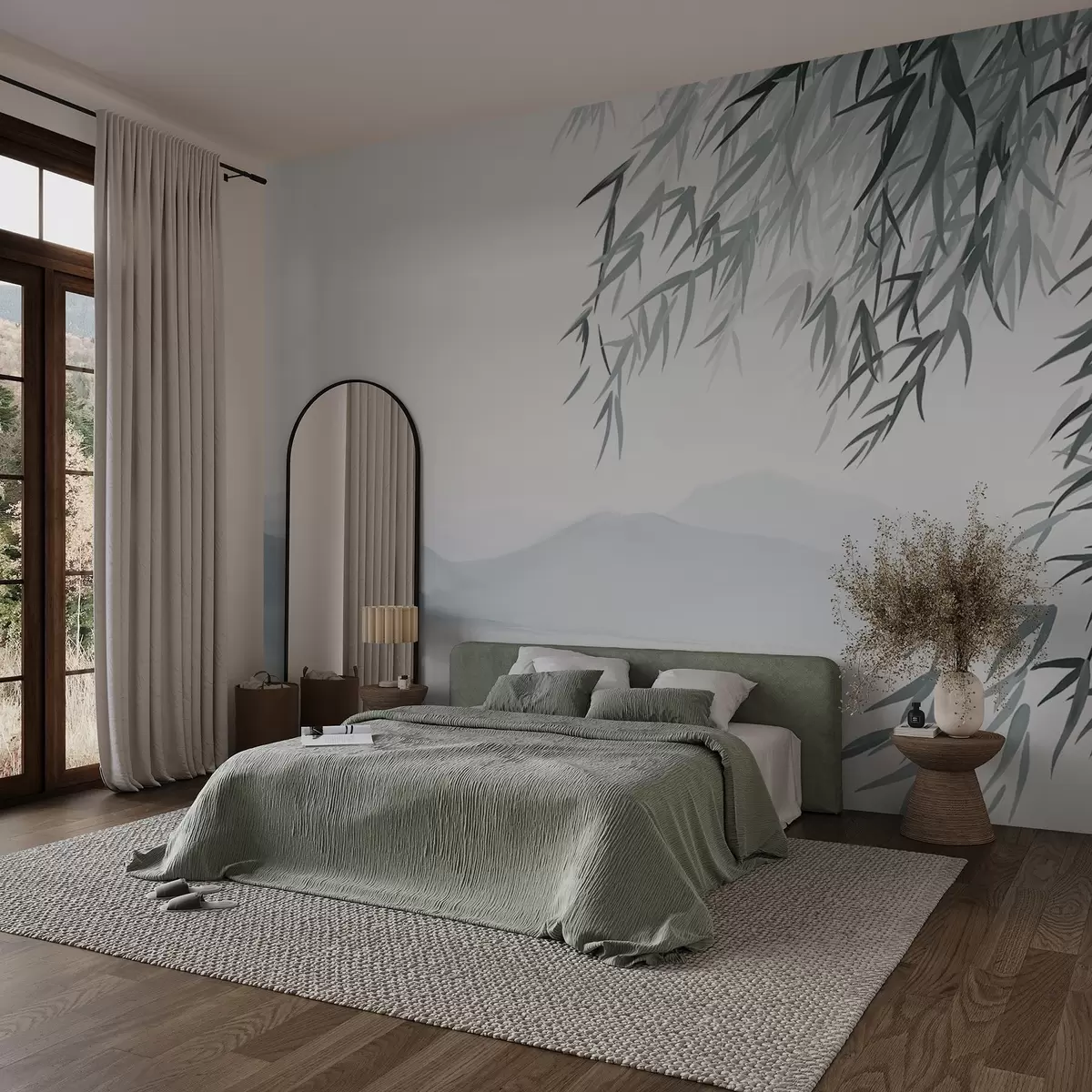 Zidne murale Lišće bambusa visi nad jezerom s planinama u pozadini, nježno plavi i bijeli tonovi, stil slikanja tintom br. w09048