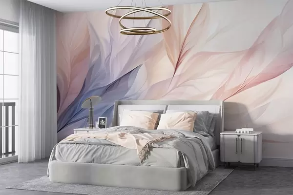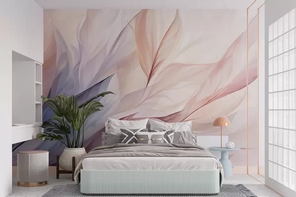 Zidne murale Apstraktni cvjetni dizajn s lepršavim laticama u pastelnim nijansama ružičaste, breskve i plave, stvarajući meku i sanjivu kompoziciju br. w09049