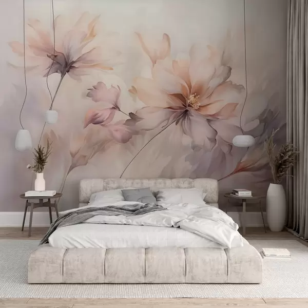 Zidne murale Nježna cvjetna umjetnost s velikim cvjetovima pastelnih boja s prozirnim laticama, mekim stabljikama i nježnom difuznom pozadinom br. w09050