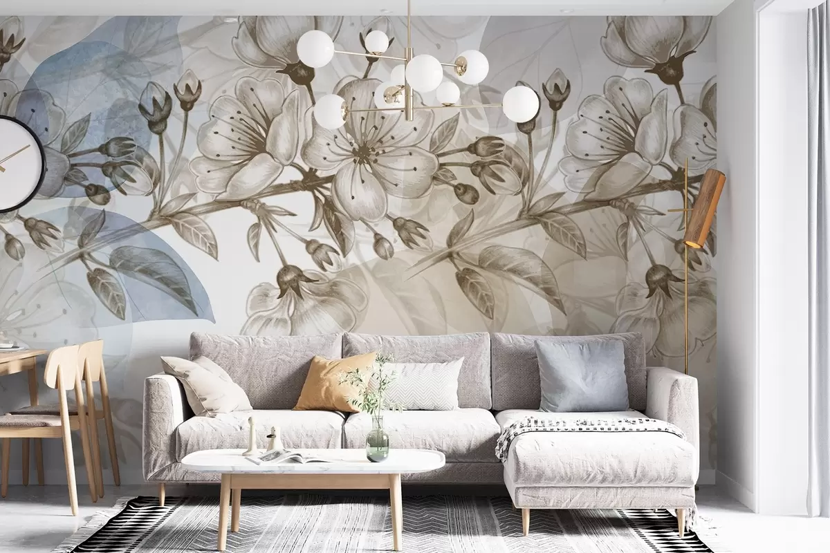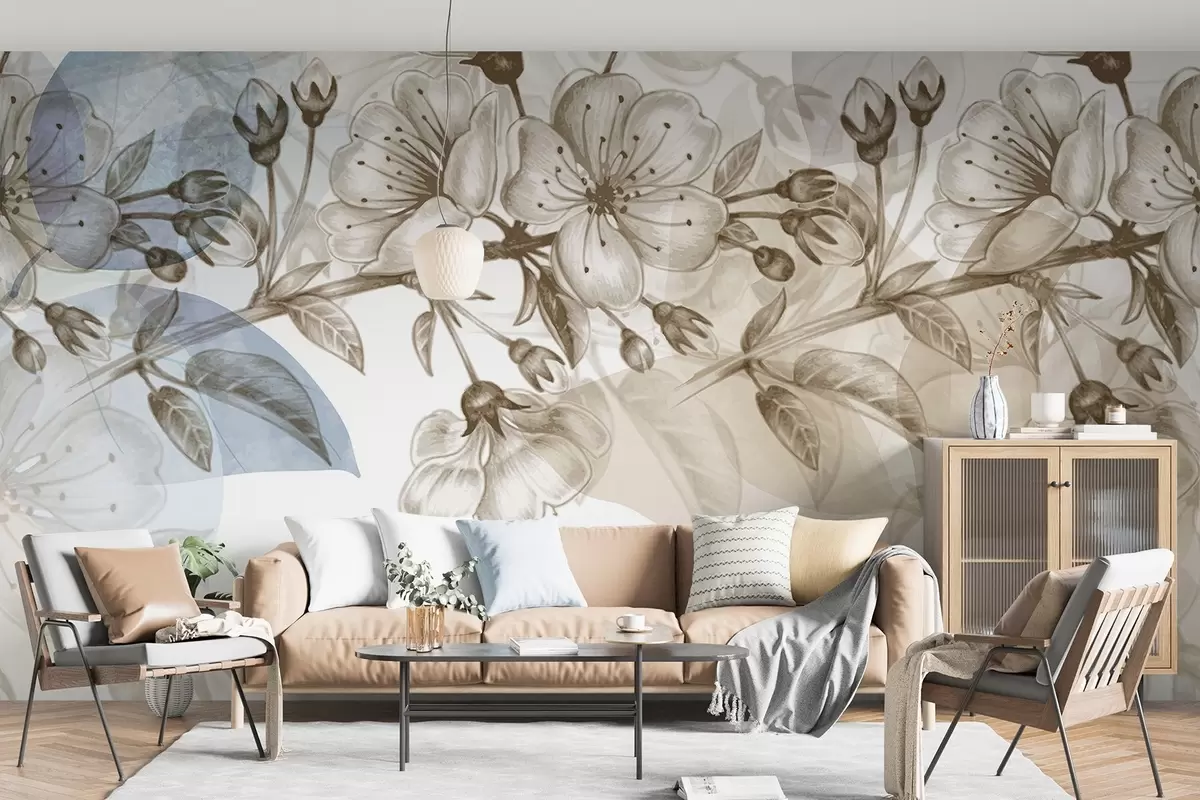 Zidne murale Grana trešnjinog cvijeta s cvjetovima i pupoljcima, sepia tonovi, nježna pozadina poput akvarela s plavim i smeđim nijansama br. w09051
