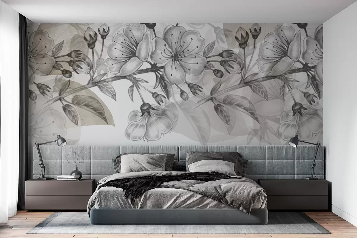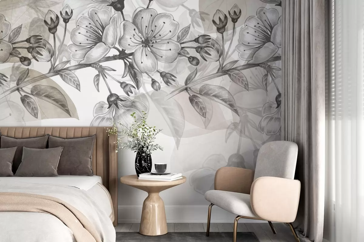 Zidne murale Grana trešnjinog cvijeta s cvjetovima i pupoljcima, sepia tonovi, nježna pozadina poput akvarela sa sivim i smeđim nijansama br. w09051v1