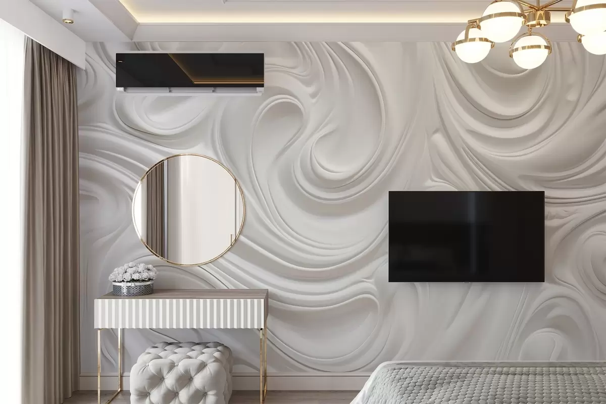 Zidne murale Bijela apstraktna moderna umjetnost s fluidnim kovitlacima i valovima, glatka tekstura, elegantan dizajn, minimalistička estetika br. w09059
