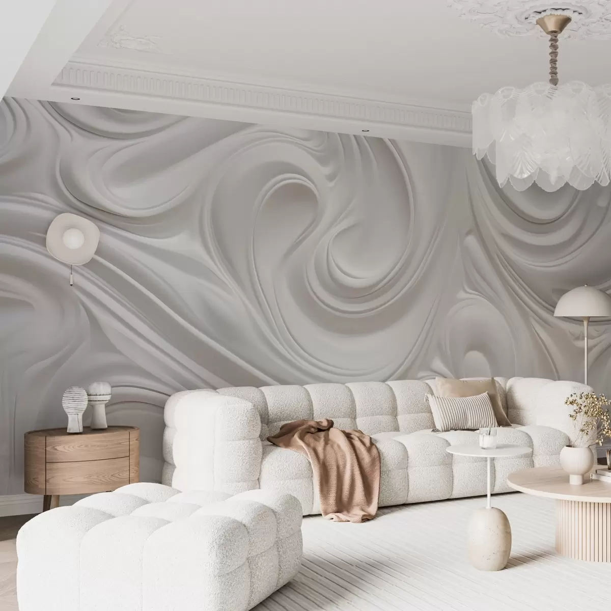 zidne murale Bijela apstraktna moderna umjetnost s fluidnim kovitlacima i valovima, glatka tekstura, elegantan dizajn, minimalistička estetika w09059