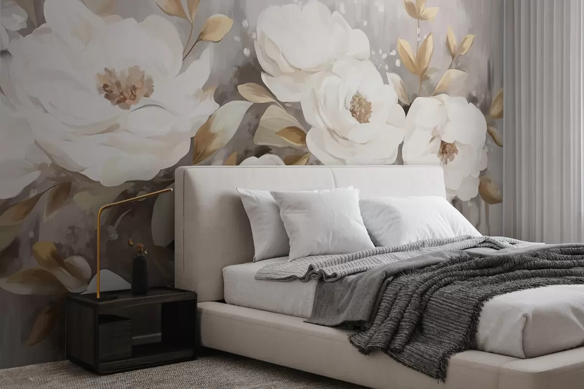 Zidne murale Bijelo cvijeće sa žutim lišćem, meke latice, nježan cvjetni aranžman, neutralna paleta boja, teksturirani potezi kistom br. w09062