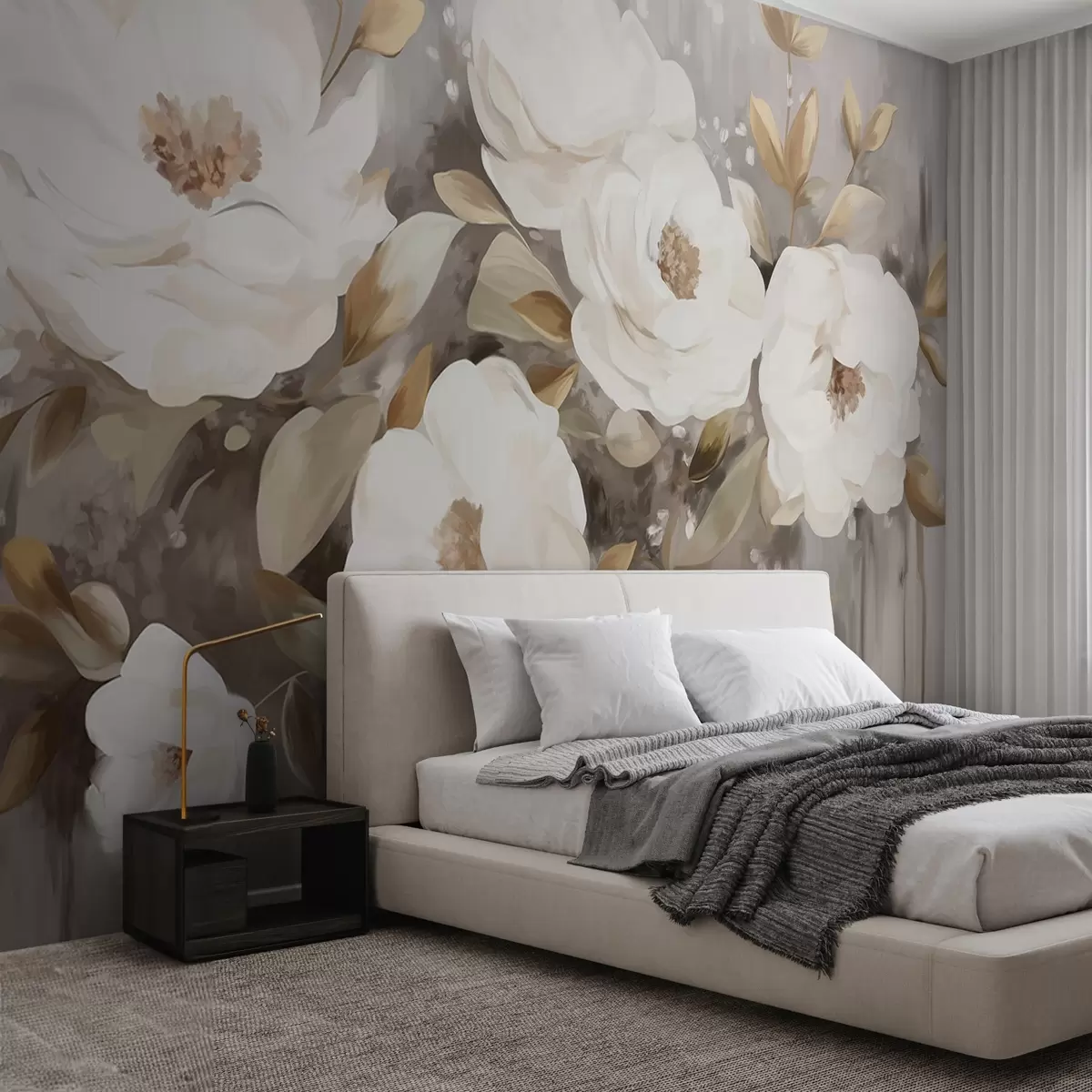 Zidne murale Bijelo cvijeće sa žutim lišćem, meke latice, nježan cvjetni aranžman, neutralna paleta boja, teksturirani potezi kistom br. w09062