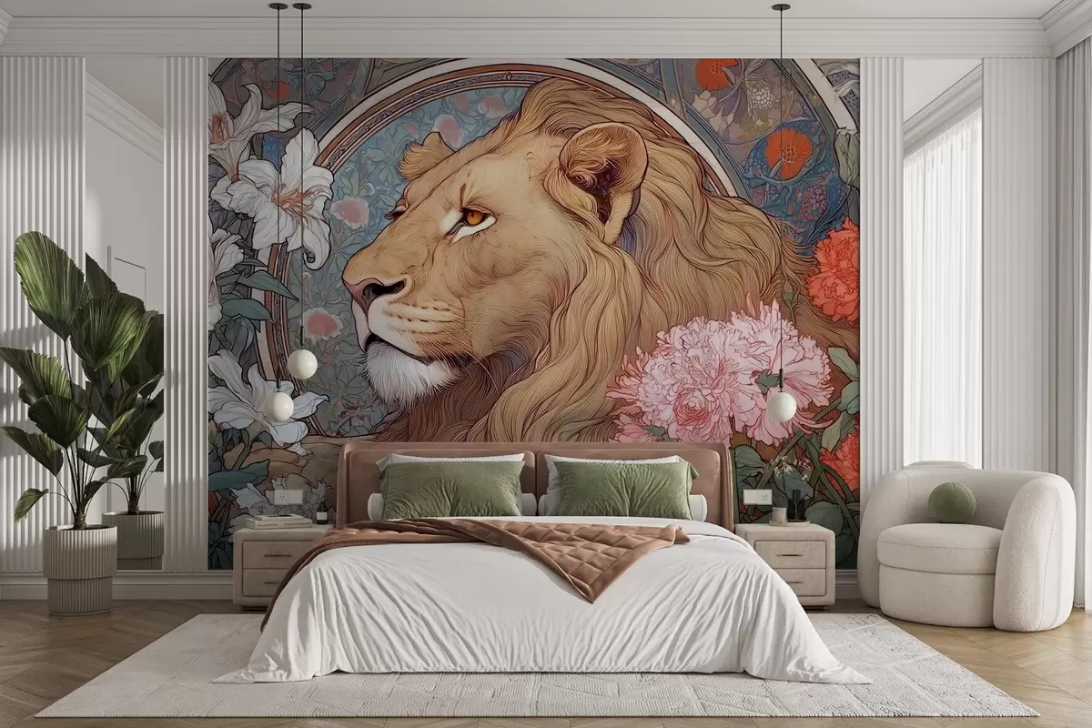 Zidne murale Lav okružen mnoštvom cvijeća u stilu Alphonsea Muche br. w09073