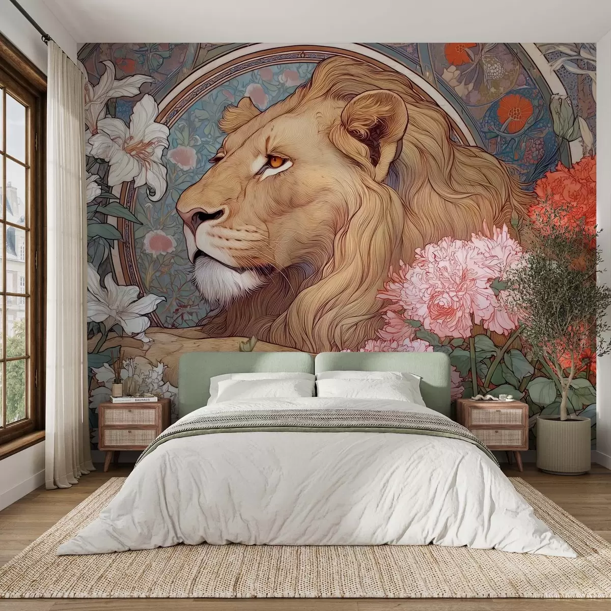 Zidne murale Lav okružen mnoštvom cvijeća u stilu Alphonsea Muche br. w09073