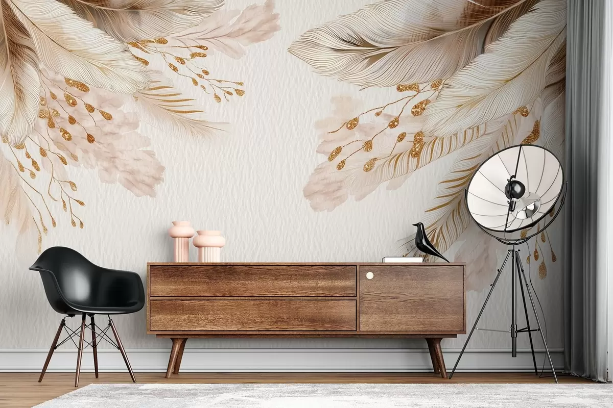 Zidne murale Pampas trava i perje u stilu akvarela u bež i bijeloj boji na papiru br. w09079