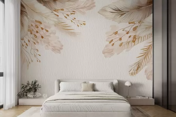 Zidne murale Pampas trava i perje u stilu akvarela u bež i bijeloj boji na papiru br. w09079