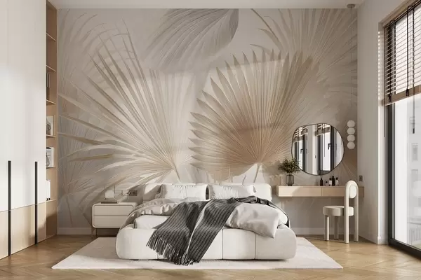 Zidne murale Mekane lepeze od tropskog lišća u svijetlim bež i plavičastim tonovima br. w09084