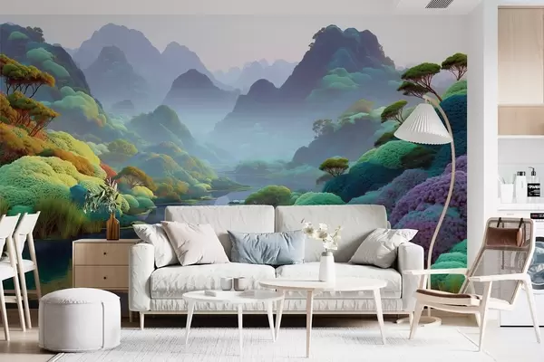 Zidne murale Planinski krajolik s rijekom u plavim tonovima s drvećem i grmljem br. w09088