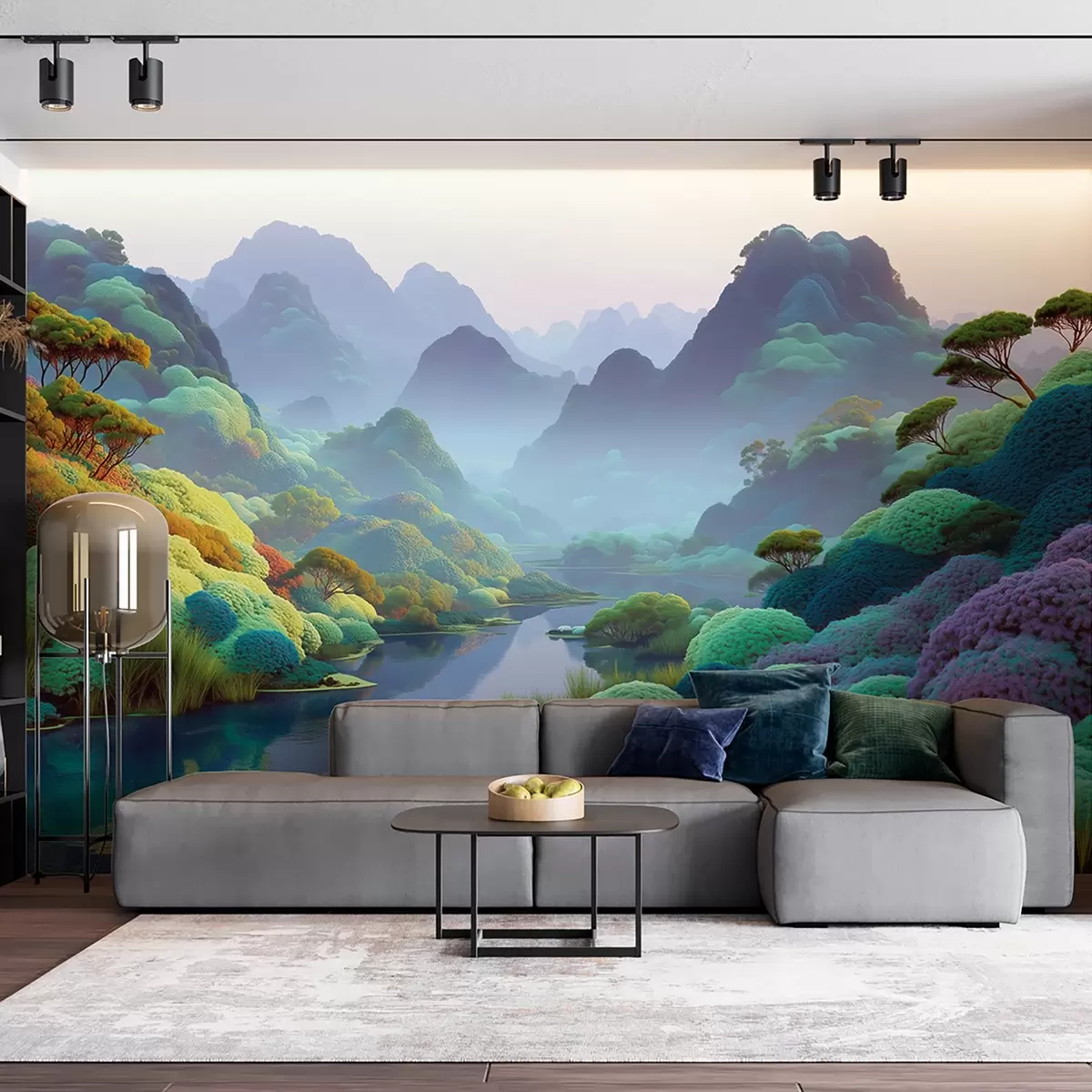 zidne murale Planinski krajolik s rijekom u plavim tonovima s drvećem i grmljem w09088