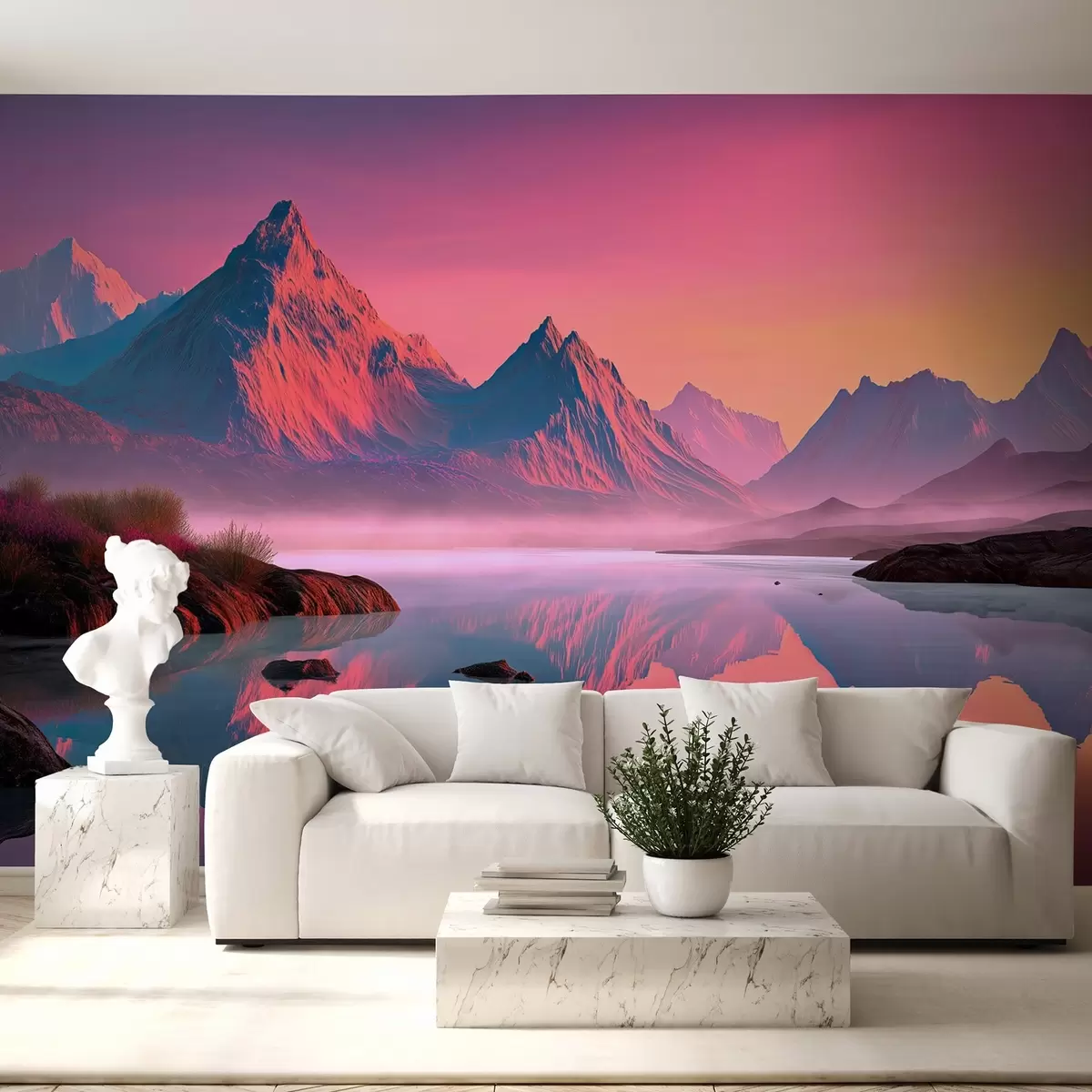Zidne murale Romantični krajolik zalaska sunca s rijekom i planinama u ružičastim nijansama br. w09093