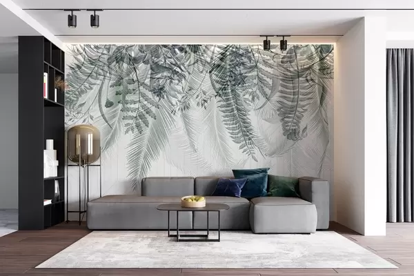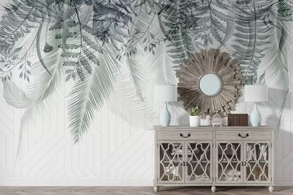 zidne murale Nježno padajuće tropsko lišće paprati i palmi, geometrijska pozadina, meko svjetlo, prigušene boje, elegantno  w09106