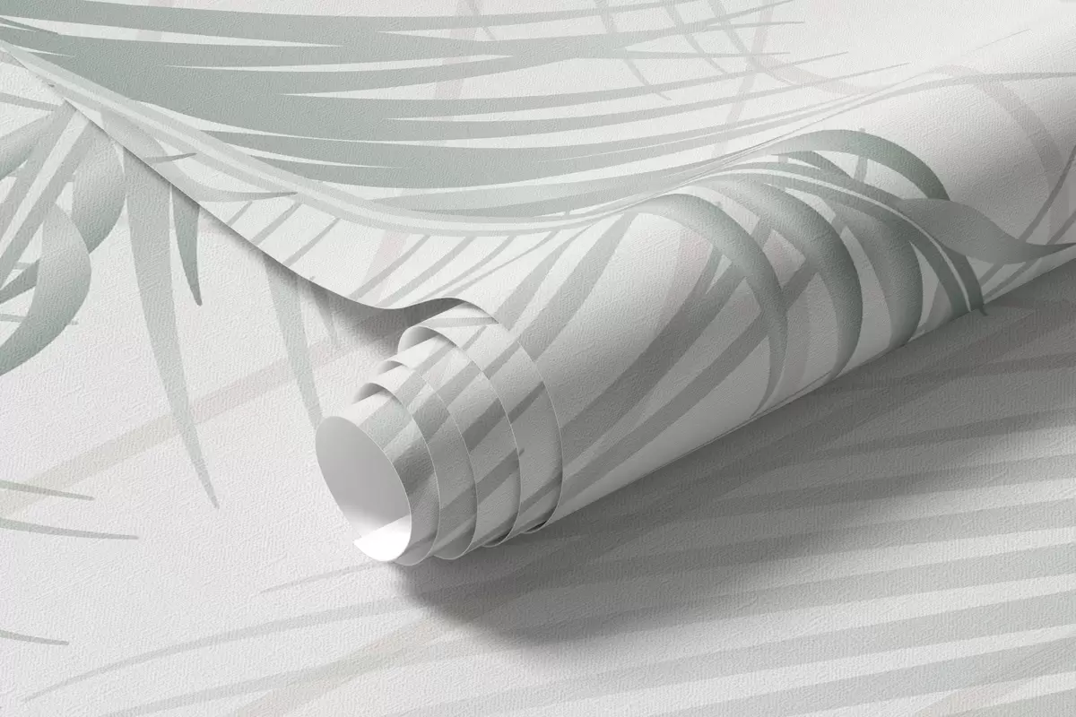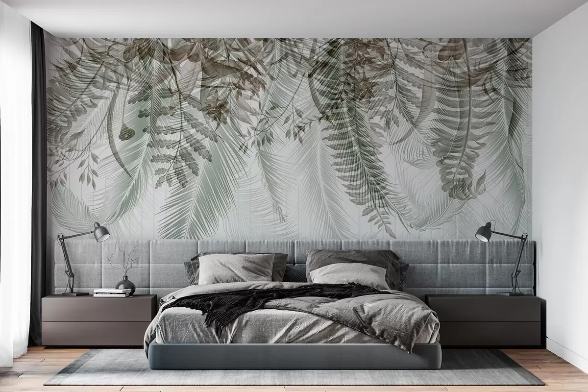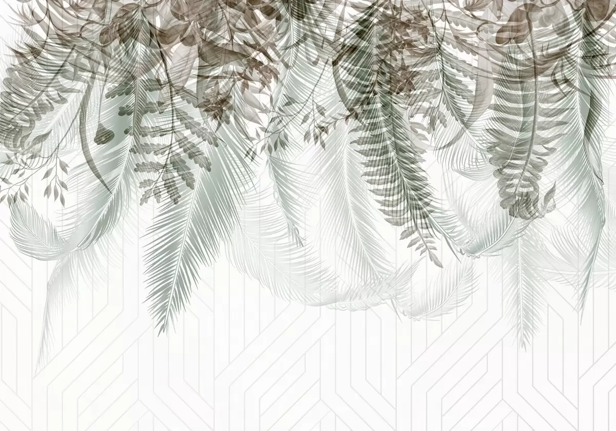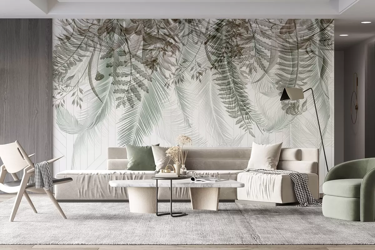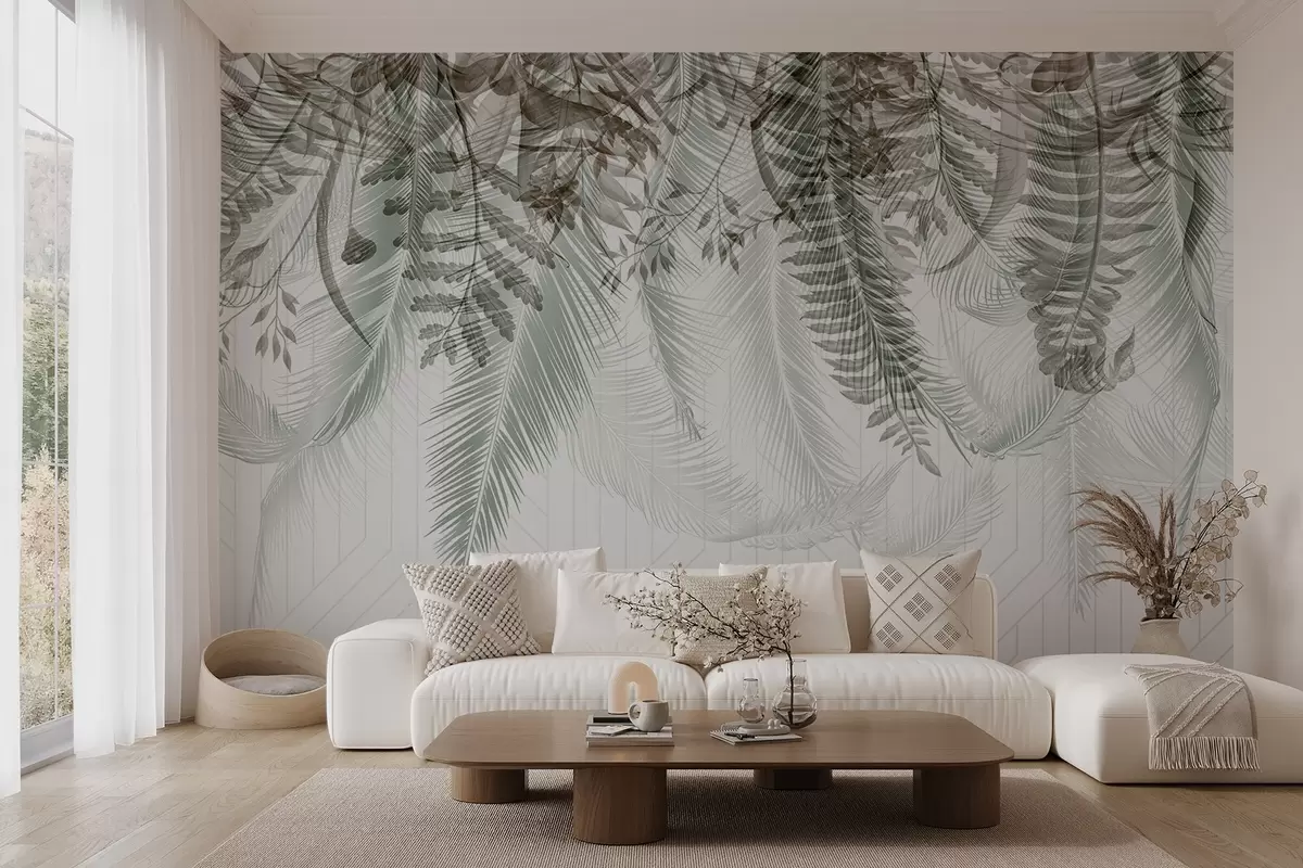 Zidne murale Nježno padajuće tropsko lišće paprati i palmi, geometrijska pozadina, meko svjetlo, prigušene boje, elegantno br. w09106v1