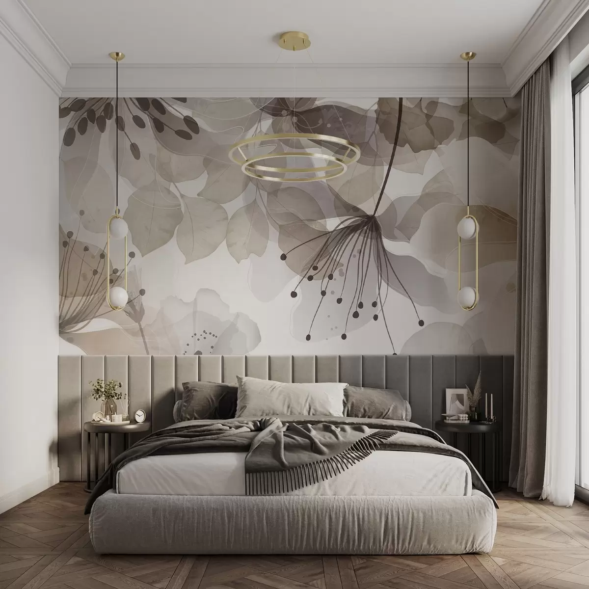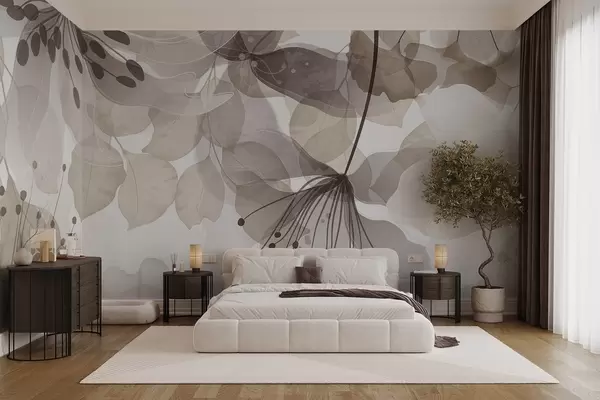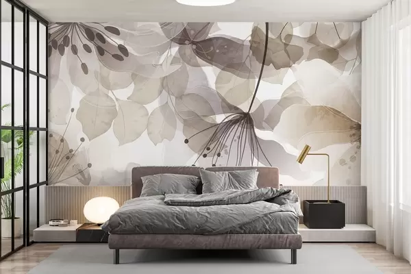 Zidne murale Cvijeće i lišće u bež bojama, prozirne latice i lišće, mekani akvarelni efekt, nježne linije, bijela pozadina br. w09107v1