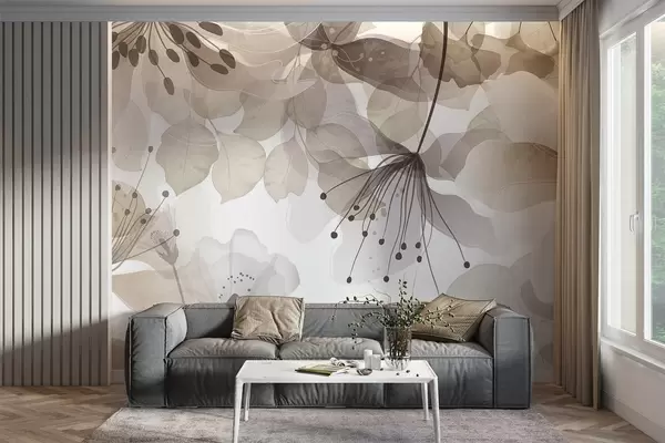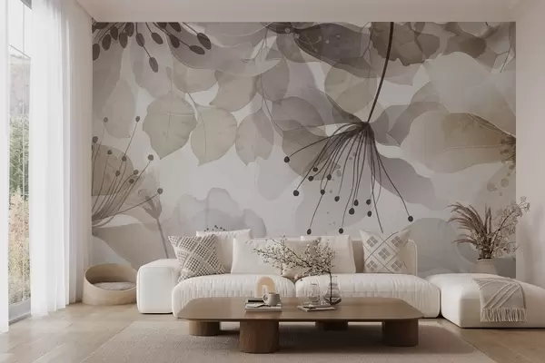 Zidne murale Cvijeće i lišće u bež bojama, prozirne latice i lišće, mekani akvarelni efekt, nježne linije, bijela pozadina br. w09107v1