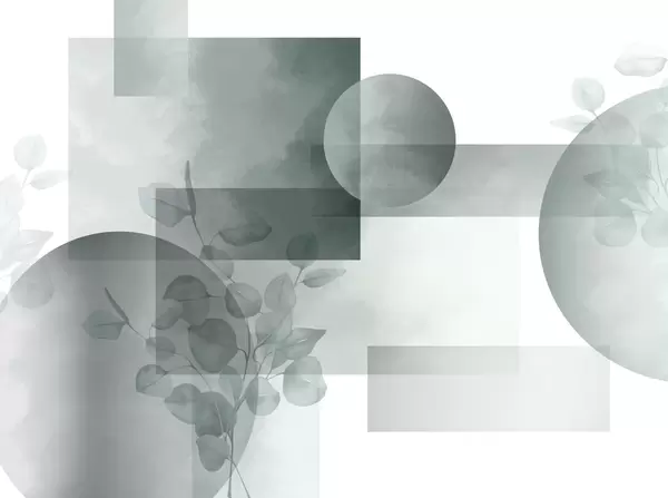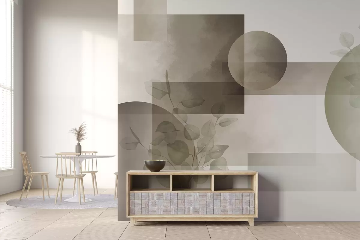 Zidne murale Apstraktni moderni minimalistički geometrijski dizajn s krugovima i pravokutnicima, listovima eukaliptusa, efektom akvarela br. w09110v1