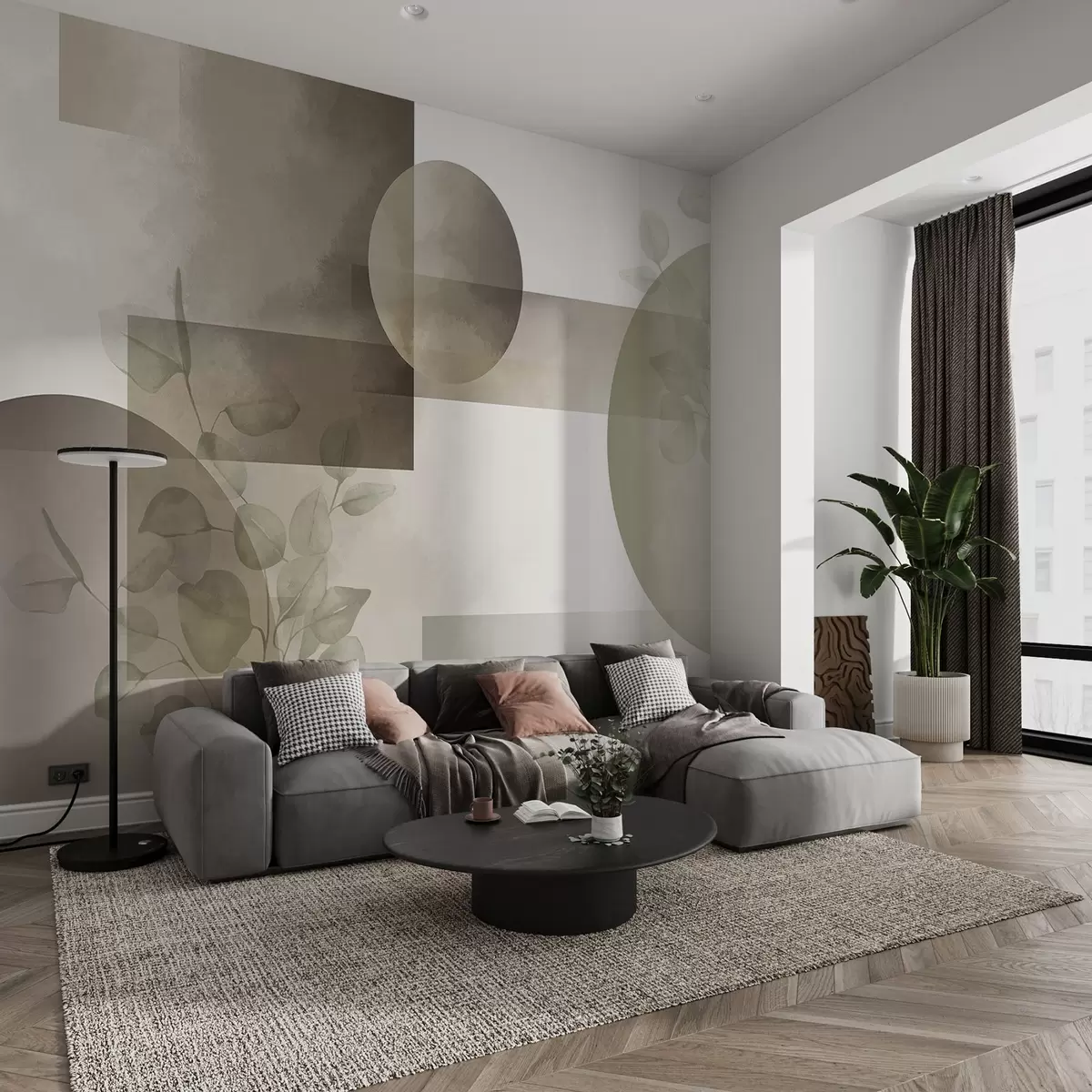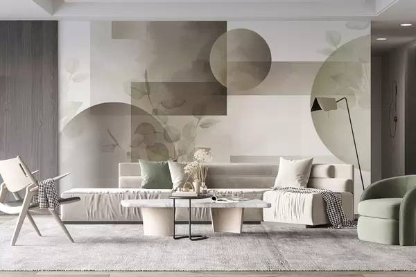 Zidne murale Apstraktni moderni minimalistički geometrijski dizajn s krugovima i pravokutnicima, listovima eukaliptusa, efektom akvarela br. w09110v1