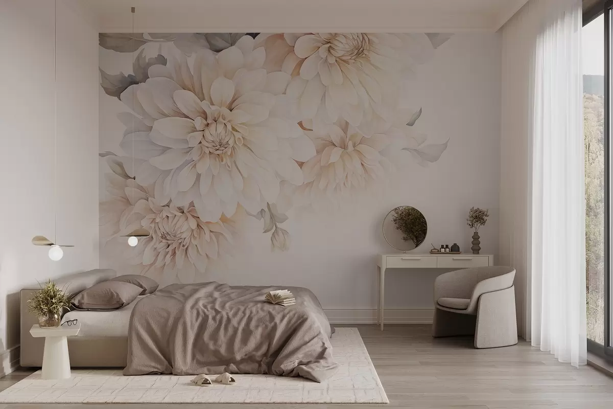 Zidne murale Pastelne dalije s mekim, nježnim laticama breskve i bijelog svjetla u stilu akvarela, mekana pozadina br. w09115