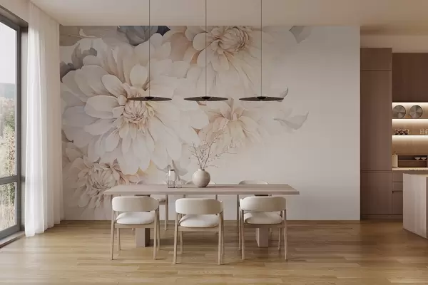 Zidne murale Pastelne dalije s mekim, nježnim laticama breskve i bijelog svjetla u stilu akvarela, mekana pozadina br. w09115