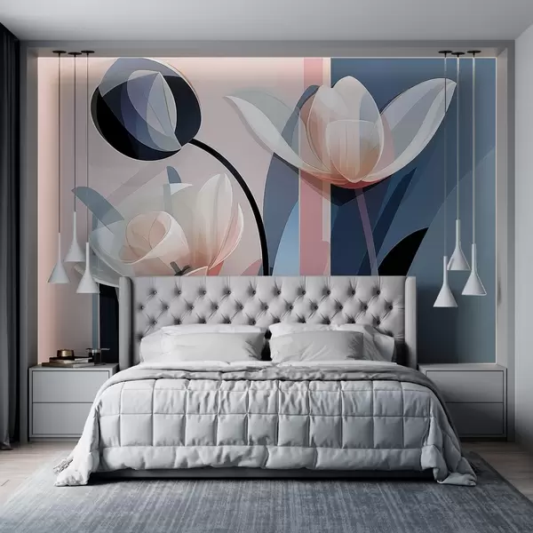 Zidne murale Apstraktni moderni dizajn s tulipanima s prozirnim laticama u pastelnim nijansama ružičaste, bijele i tamnoplave br. w09116