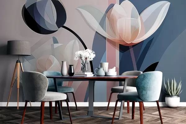 Zidne murale Apstraktni moderni dizajn s tulipanima s prozirnim laticama u pastelnim nijansama ružičaste, bijele i tamnoplave br. w09116
