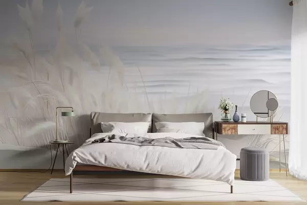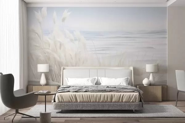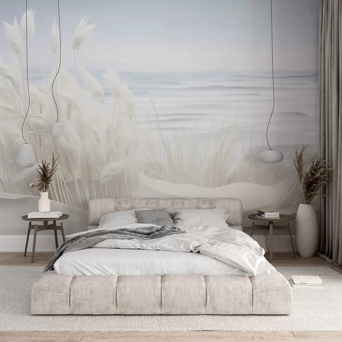 Zidne murale Pejzaž s bijelom pampas travom na pješčanoj dini, sa svijetloplavim oceanom u pozadini, mekan, minimalistički stil br. w09132