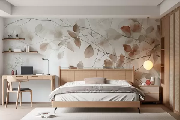 Zidne murale Teksturna akvarelna imitacija smeđeg lišća i grana, meke boje, nježni detalji na bijeloj pozadini br. w09133