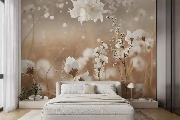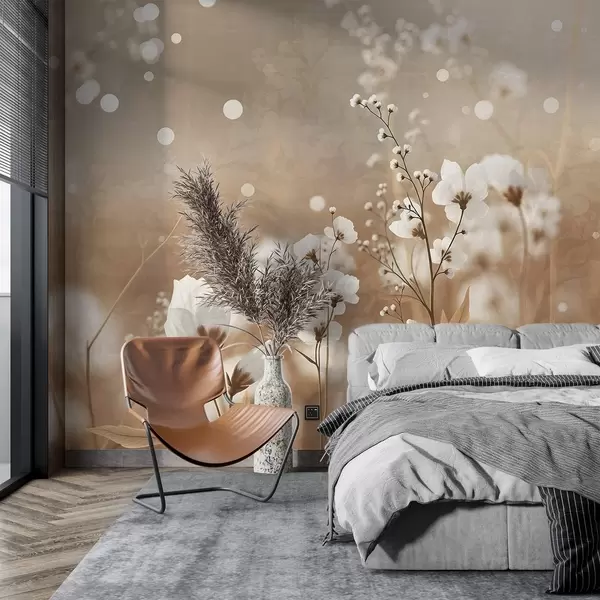 zidne murale Bijelo cvijeće sa smeđim stabljikama i lišćem u polju, bokeh efekt, topla paleta boja, elegantno umjetničko djelo inspirirano prirodom w09135