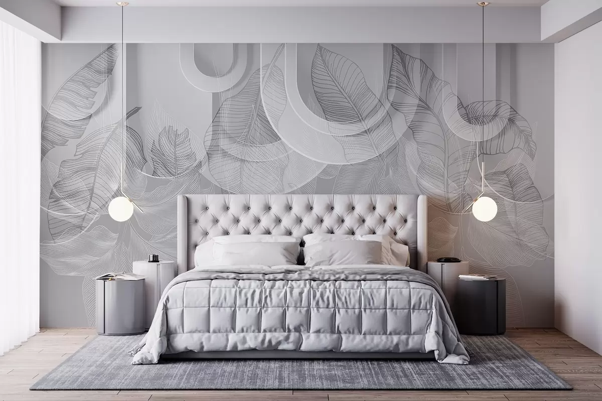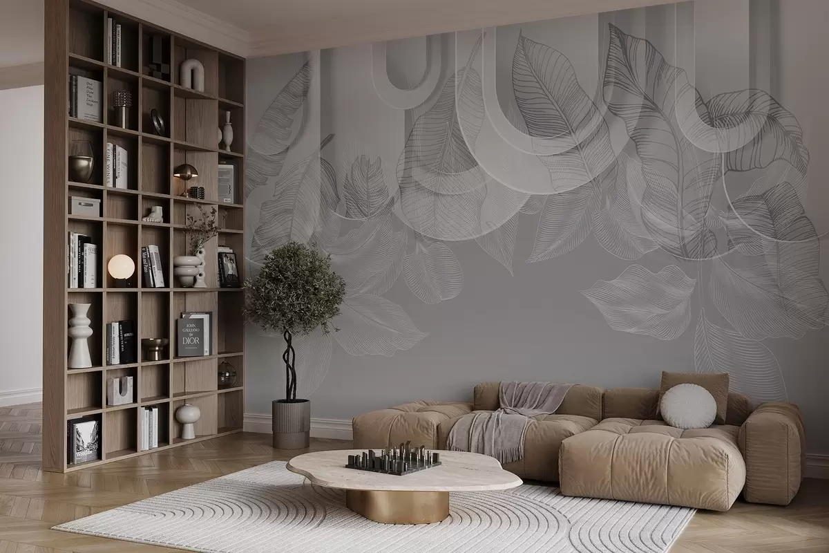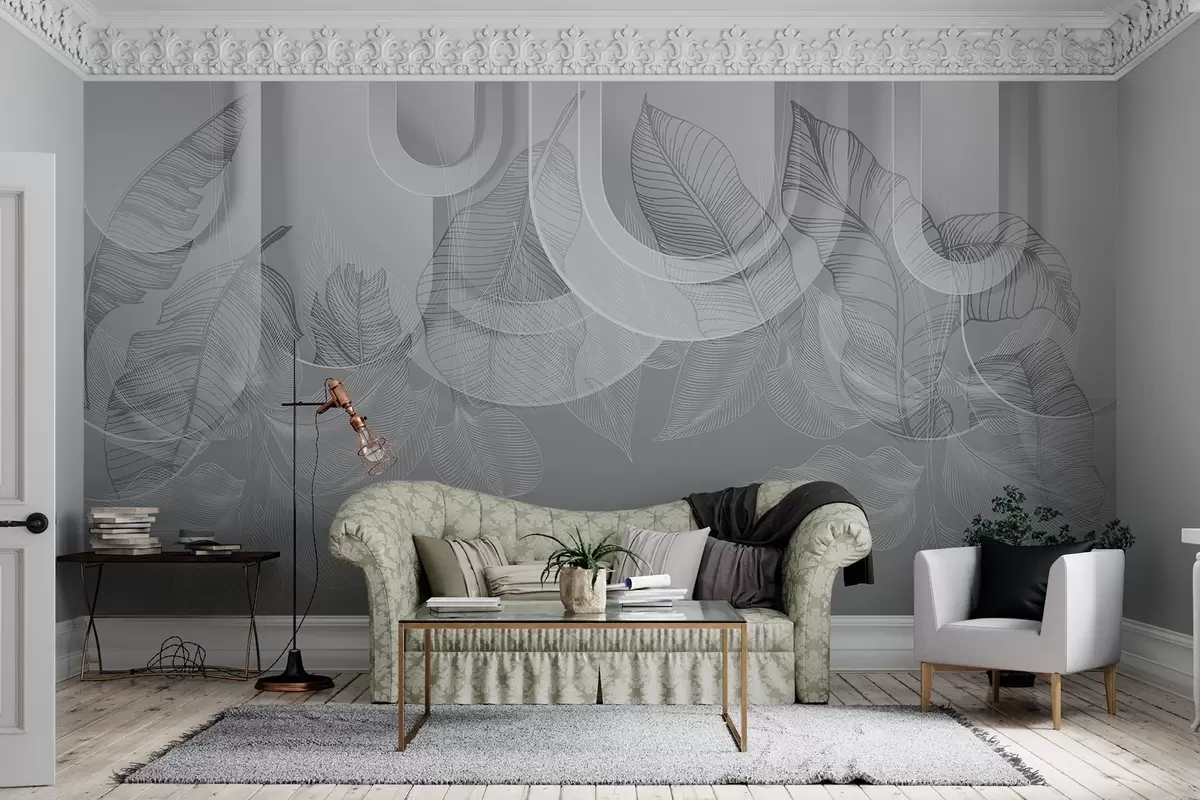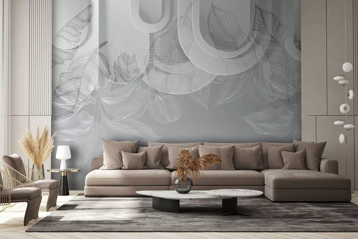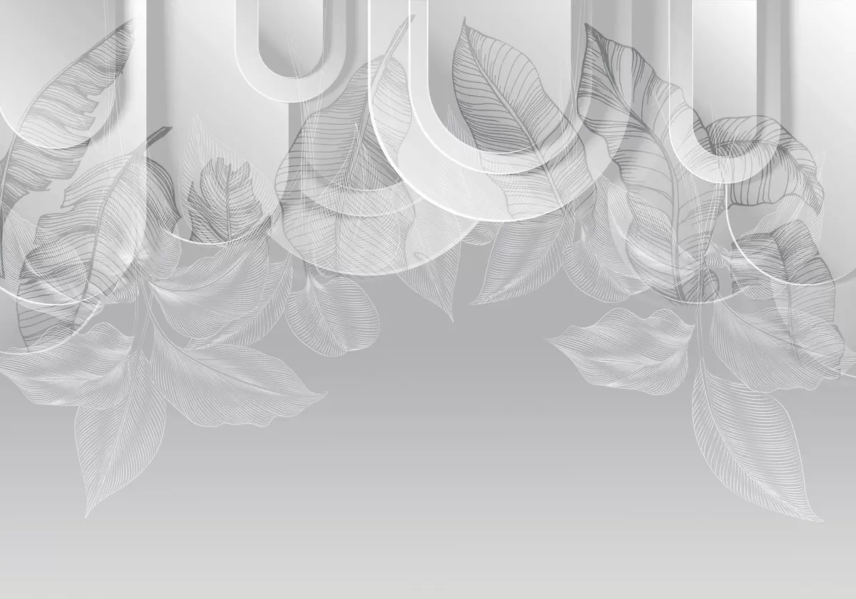 Zidne murale Apstraktna pozadina sa sivim lukovima i bijelim tropskim lišćem, minimalistički dizajn, elegantan i moderan, neutralna paleta boja br. w09138