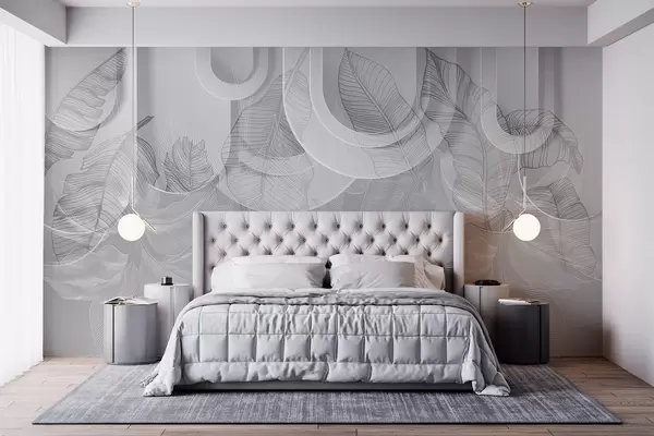 Zidne murale Apstraktna pozadina sa sivim lukovima i bijelim tropskim lišćem, minimalistički dizajn, elegantan i moderan, neutralna paleta boja br. w09138