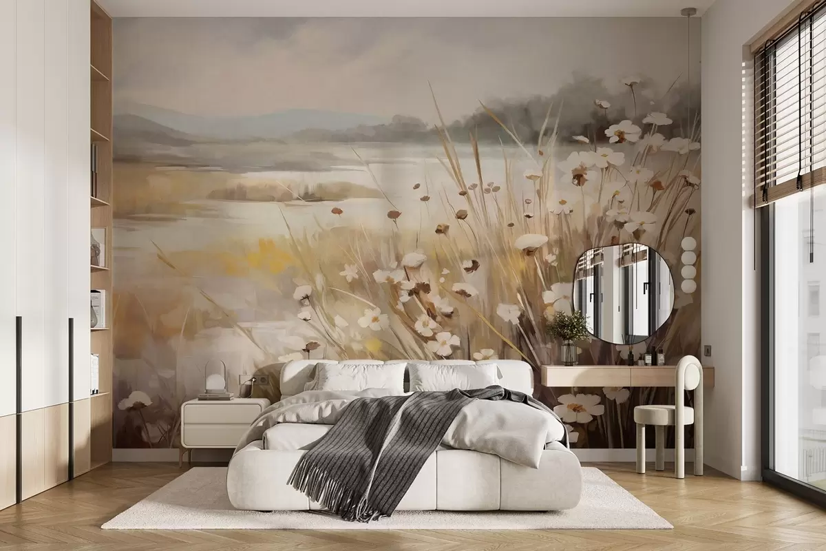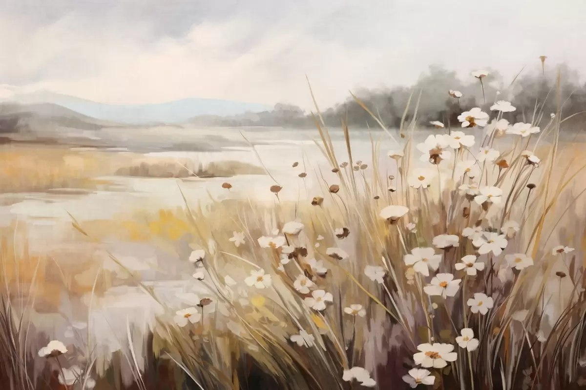 Zidne murale Polje visoke trave i bijelih tratinčica, drveće u pozadini, pod oblačnim nebom, teksturirani krajolik, meki potezi kistom br. w09139
