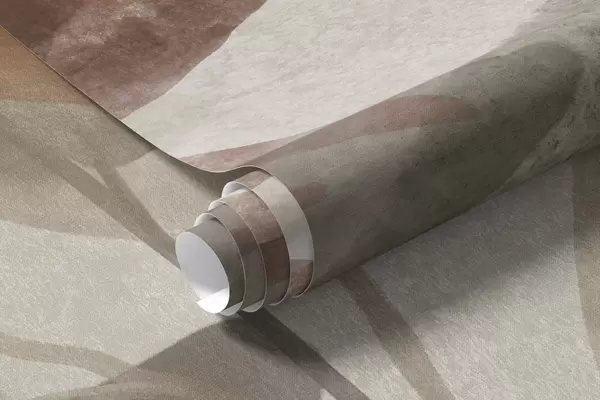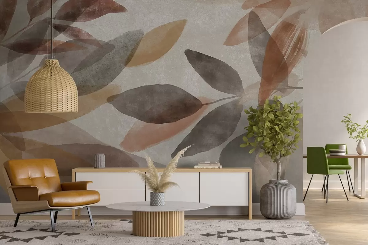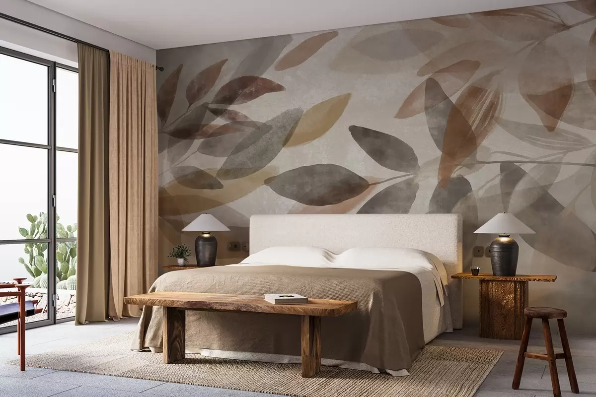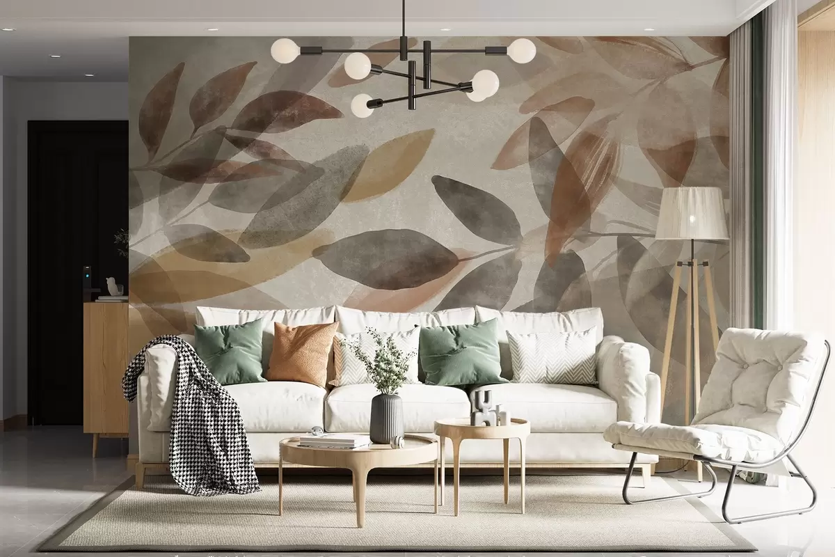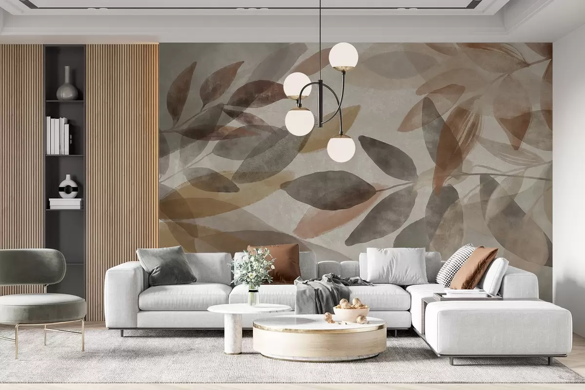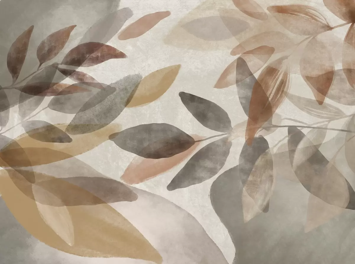 Zidne murale Apstraktno teksturirano lišće u prigušenim smeđim, bež i sivim tonovima, prozirni oblici, minimalistički stil, organski oblici br. w09140