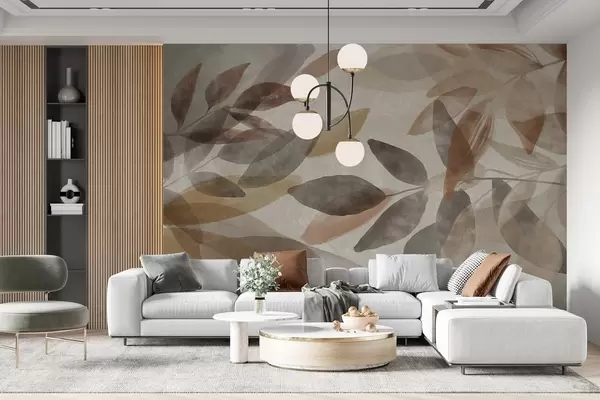 Zidne murale Apstraktno teksturirano lišće u prigušenim smeđim, bež i sivim tonovima, prozirni oblici, minimalistički stil, organski oblici br. w09140