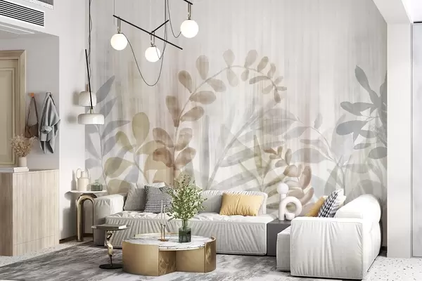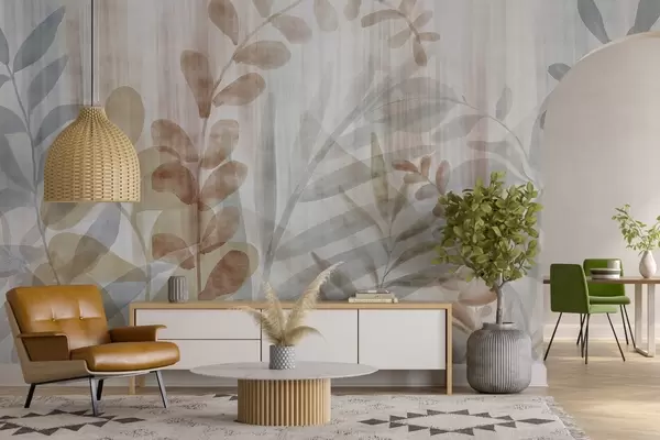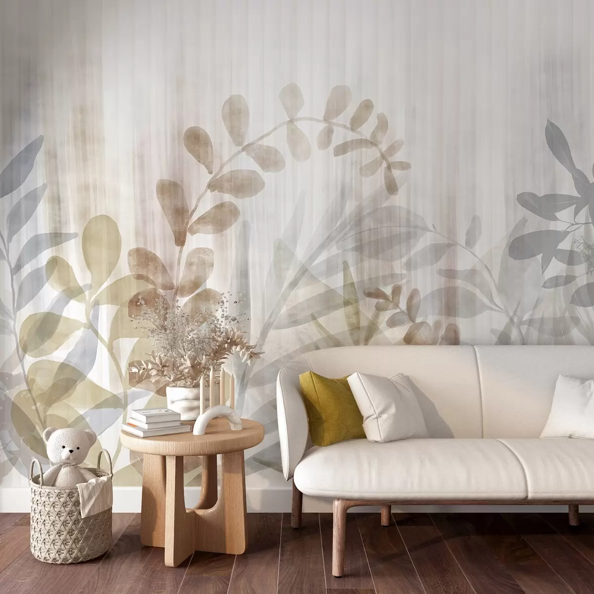 zidne murale Imitacija biljaka u akvarelu s višebojnim prigušenim lišćem, svijetla pozadina s okomitim linijama, botanička ilustracija  w09146
