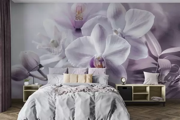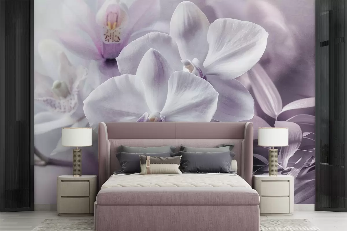 zidne murale Bijeli i lila nježni cvjetovi orhideje, meko osvjetljenje i zamućena teksturirana pozadina  w09155