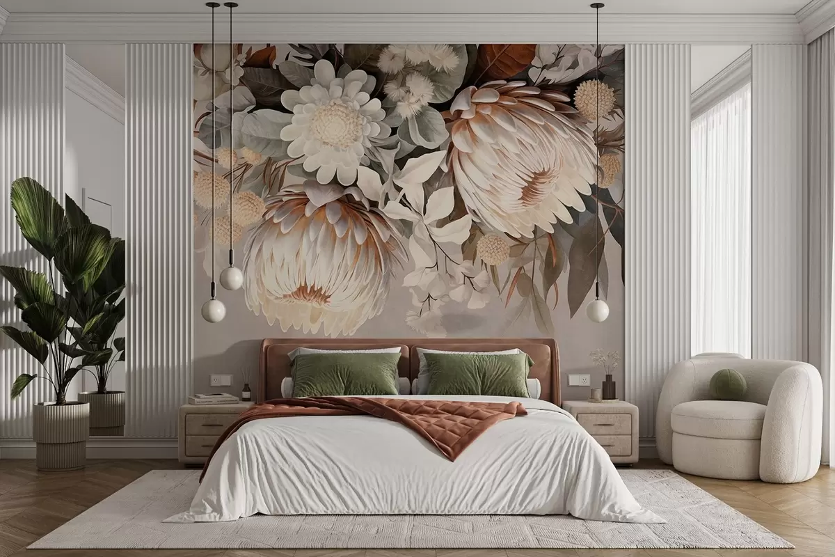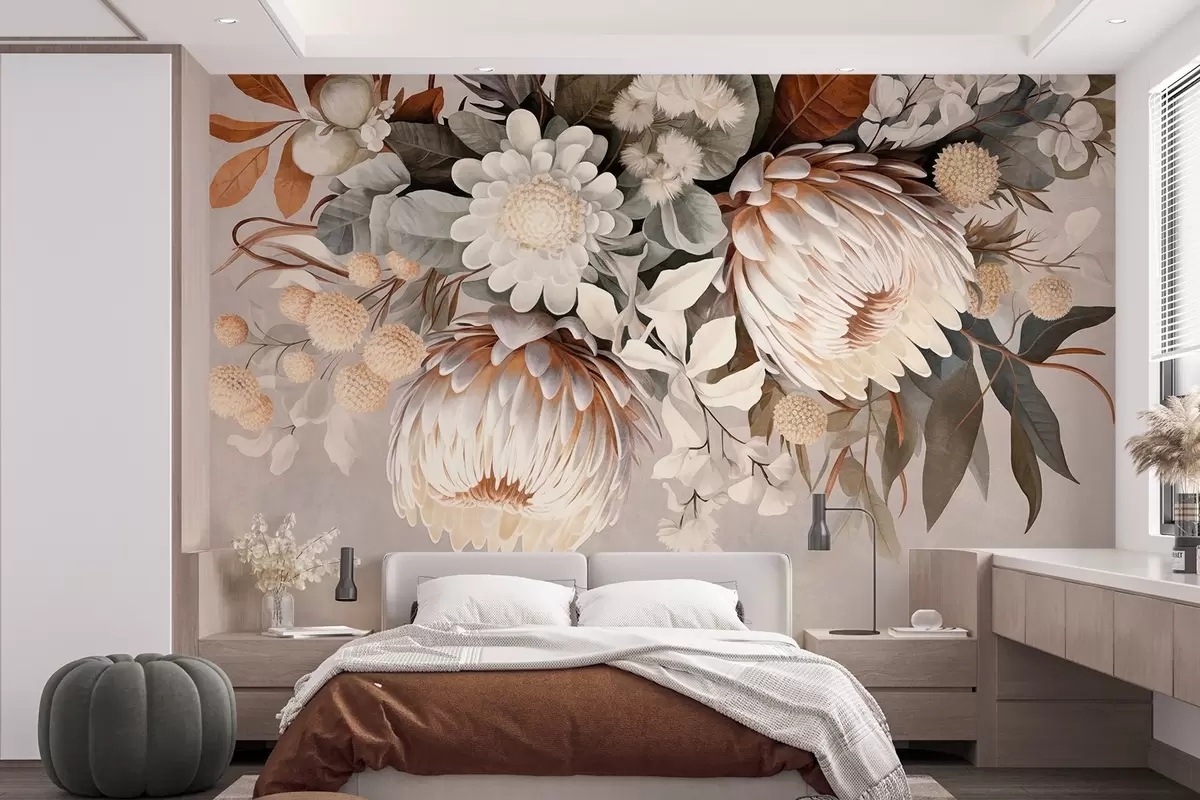 Zidne murale Velika teksturirana protea sa smeđim naglascima, bijelim tratinčicama i žutim cvjetovima, bež prigušena pozadina br. w09157