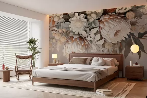 Zidne murale Velika teksturirana protea sa smeđim naglascima, bijelim tratinčicama i žutim cvjetovima, bež prigušena pozadina br. w09157