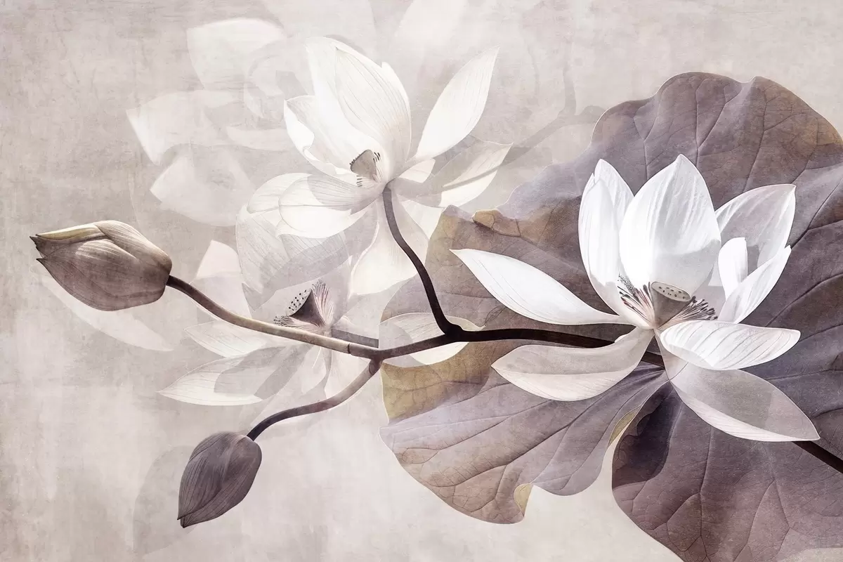 Zidne murale Zrnasto teksturirani prigušeni nježni cvjetovi lotosa s listovima i stabljikama u mekoj, bež paleti boja br. w09159