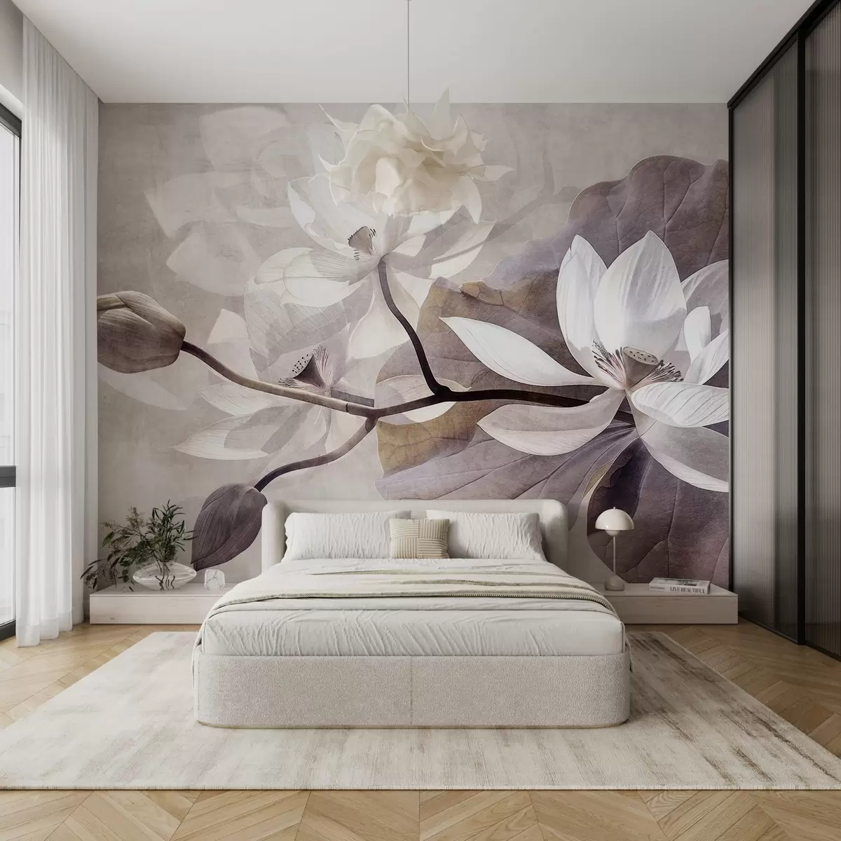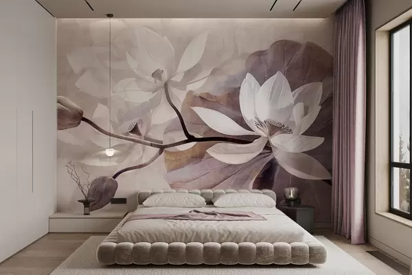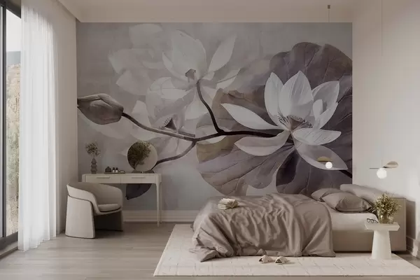 Zidne murale Zrnasto teksturirani prigušeni nježni cvjetovi lotosa s listovima i stabljikama u mekoj, bež paleti boja br. w09159