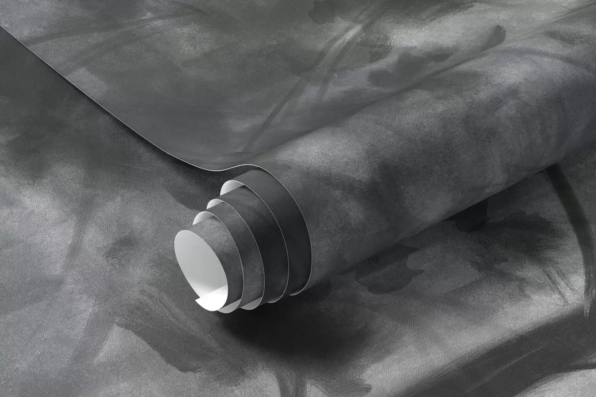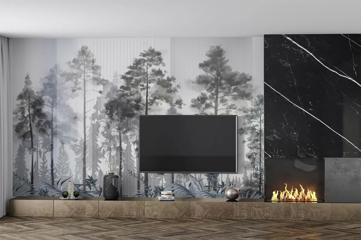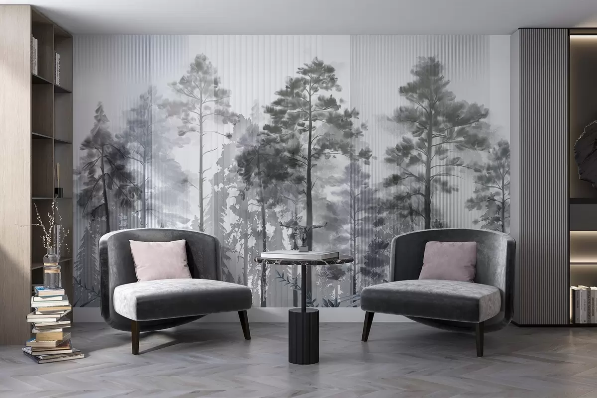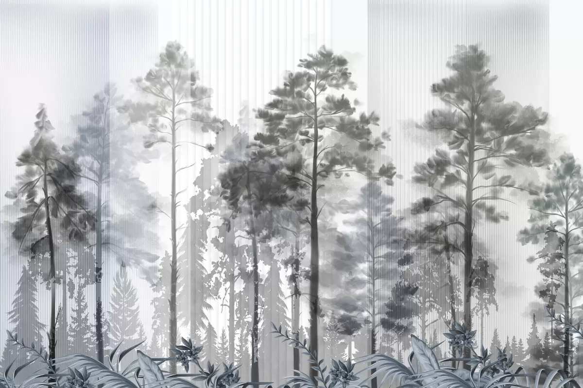 Zidne murale Gusta šuma s visokim borovima, bujnim sivim lišćem, maglovitom atmosferom s teksturama okomitih linija br. w09163v2