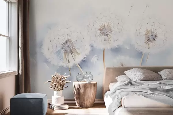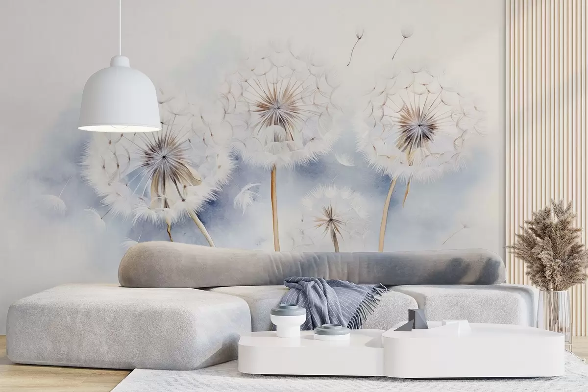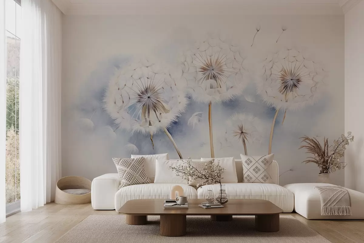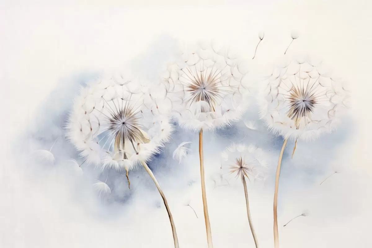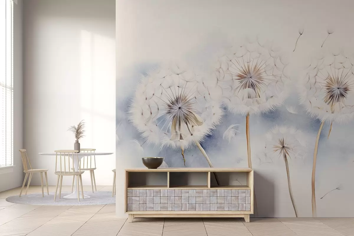 Zidne murale Teksturirani maslačci sa sjemenkama koje lebde u zraku, svijetloplava i bijela pozadina, mekani, nježni stil crtanja br. w09190