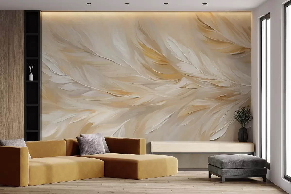 Zidne murale Bijelo i bež perje raspoređeno u tekućem printu, meka tekstura, topla paleta boja, apstraktna pozadina br. w09191