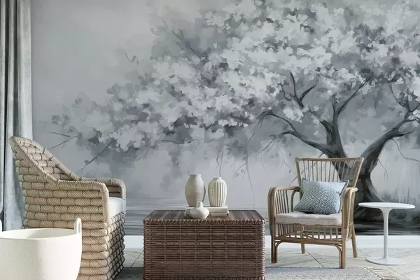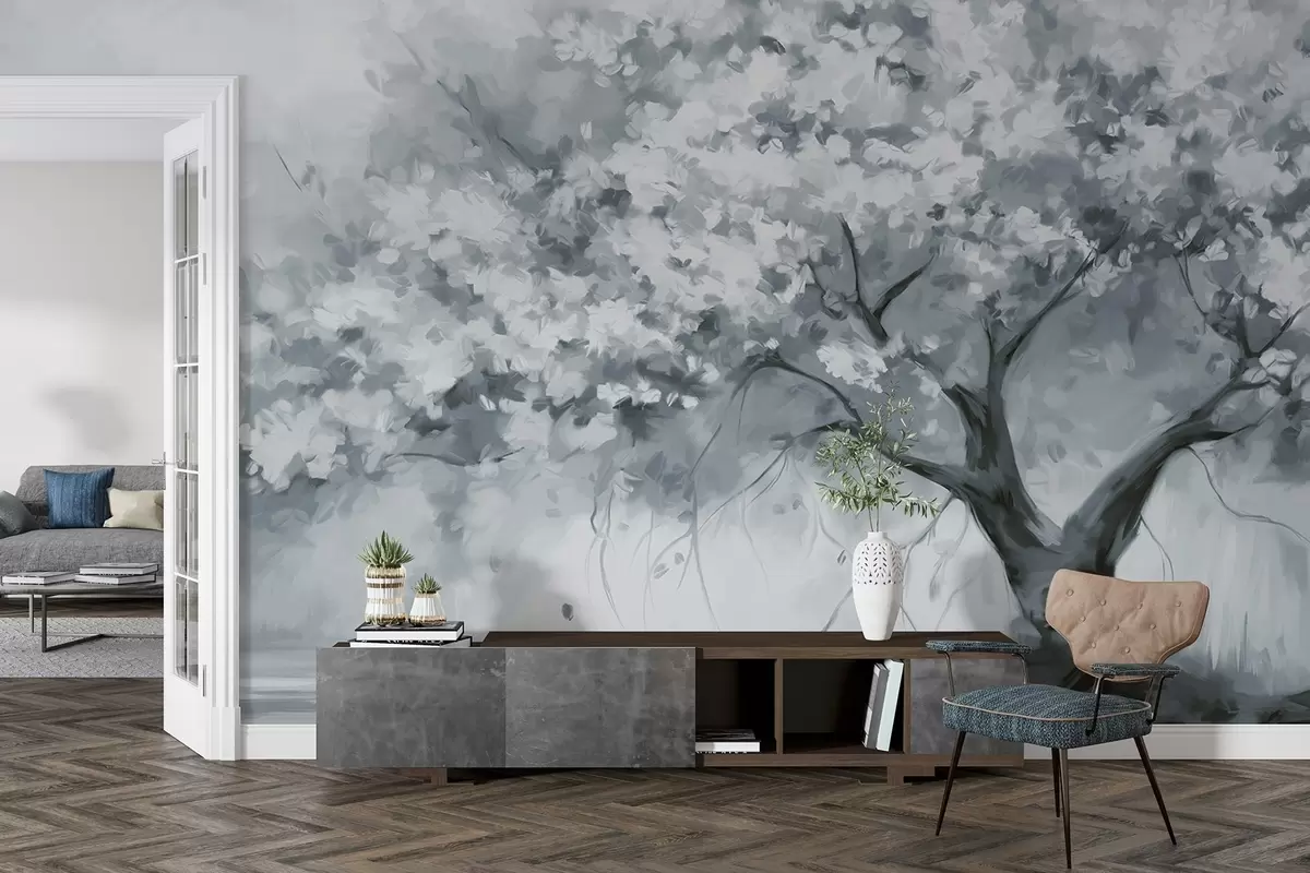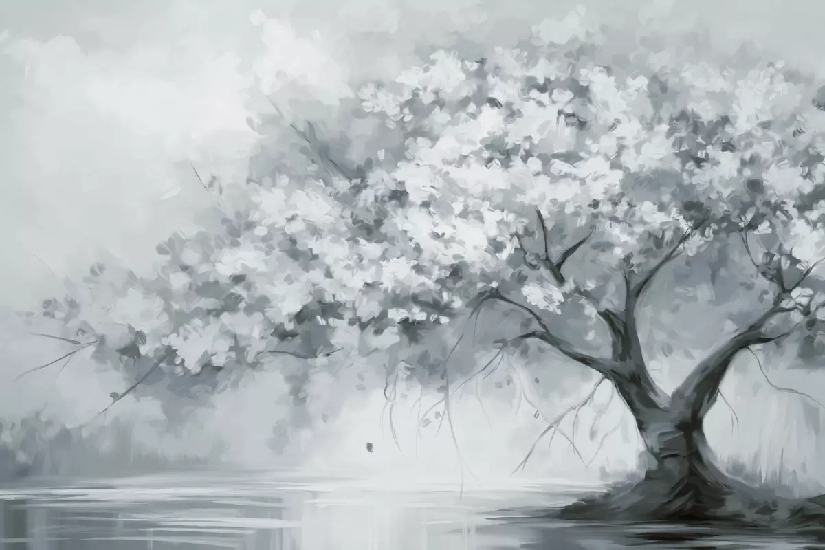 Zidne murale Apstraktno prigušeno plavo cvjetajuće drvo u punom cvatu, pored rijeke, mekani teksturirani potezi kistom i pastelne boje br. w09193v2