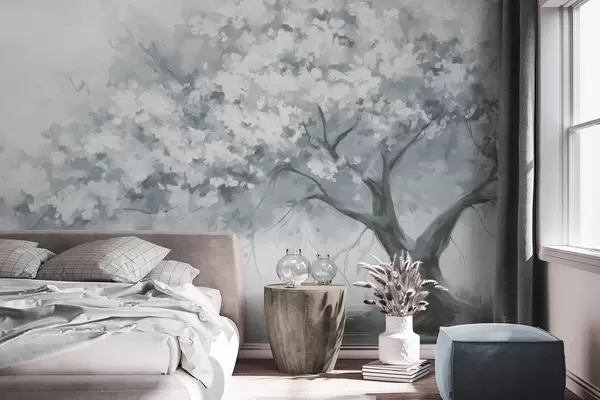 Zidne murale Apstraktno prigušeno plavo cvjetajuće drvo u punom cvatu, pored rijeke, mekani teksturirani potezi kistom i pastelne boje br. w09193v2